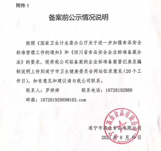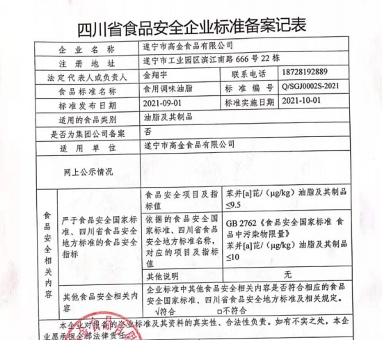 遂宁市高金食品有限公司—食用调味油脂食品备案公示(公示截止期2021.10.18)