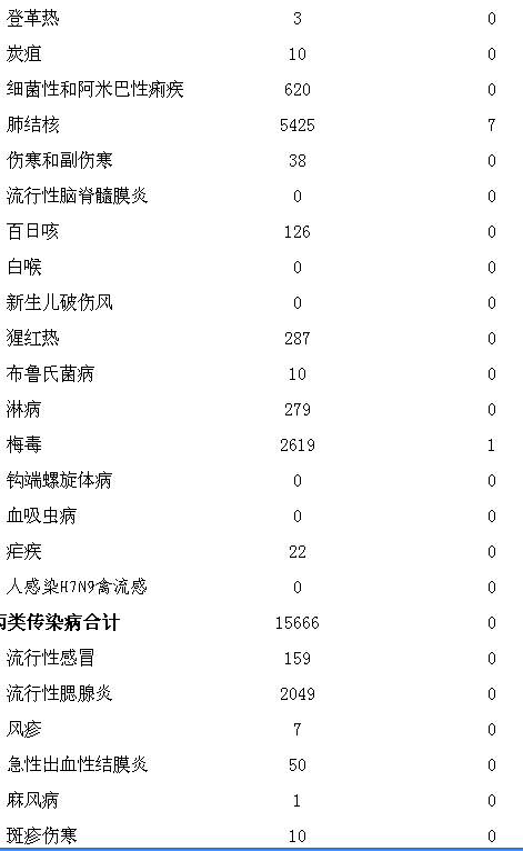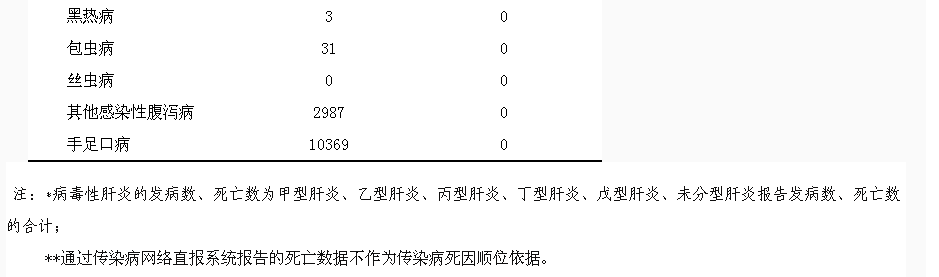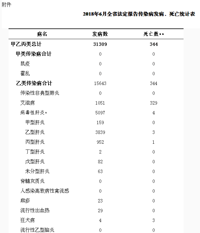 2018年6月,全省共报告乙类传染病16种,发病15643例,死亡344人;无传染性非典型肺炎、脊髓灰质炎、人感染高致病性禽流感、乙脑、流脑、白喉、新生儿破伤风、钩端螺旋体病、血吸虫病和人感染H7N9禽流感发病、死亡报告;报告发病数居前5位的病种依次为:肺结核、乙肝、梅毒、艾滋病和丙肝;报告死亡数居前3位的病种依次为:艾滋病、肺结核、乙肝/狂犬病。同期,全省共报告丙类传染病10种,发病15666例,无死亡;无丝虫病报告;报告发病数居前3位的病种依次为:手足口病、其他感染性腹泻病和流行性腮腺炎。