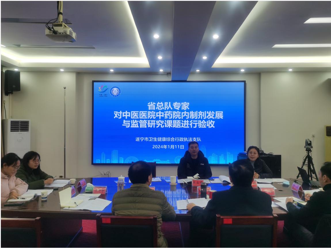 2024年1月11日,市支队承担的《中医医院中药院内制剂发展与监管研究》项目顺利通过结题验收,四川省卫生健康综合行政执法总队中医支队副支队长王立峰、一级主任科员张继梅等专家、遂宁市支队的项目组成员和相关领导参加了验收会议。