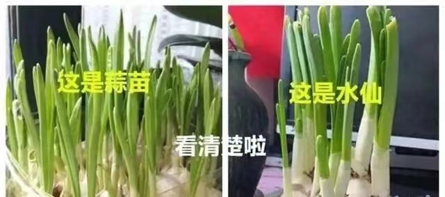 水仙和蒜叶还是有不少区别的。水仙的叶稍厚、相对短,大蒜叶子比较薄;水仙的根茎圆锥形或卵形,更像洋葱,大蒜的鳞茎为蒜瓣。最好区别的是气味,用指甲掐蒜叶或将蒜瓣打开,会有很明显的辛辣味,水仙则没有。
