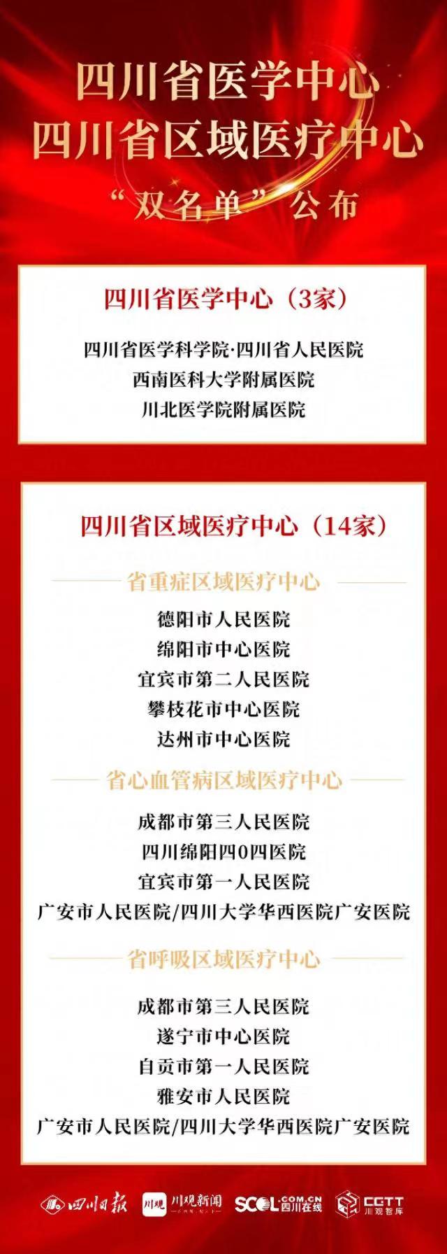 此前,四川省重症、心血管病、呼吸区域医疗中心名单也已发布,成都、川北、川南、川西、川东五大片区12家医院入选。