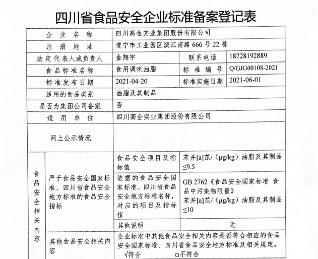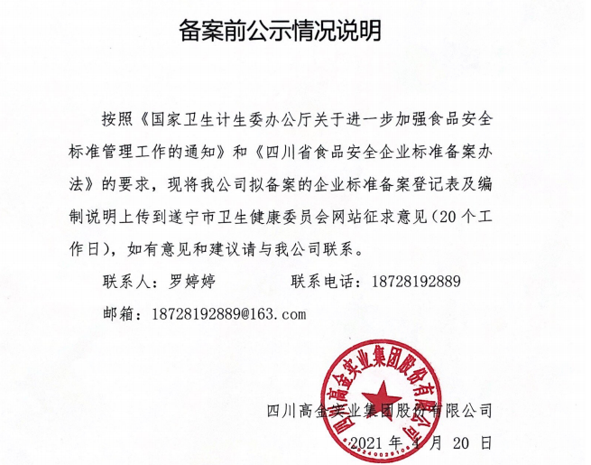 四川高金实业集团股份有限公司食品备案公示(公示截止期2021.5.25)