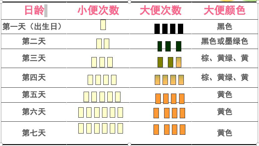 说明:产后1~7天,观察小便次数(无色或浅黄色)和大便次数(颜色),可以判断是否摄入足够的母乳。低于上述次数或者颜色明显偏离的,应及时与医护人员联系。出生7天后婴儿24小时有6次以上的小便(无色或浅黄色)。