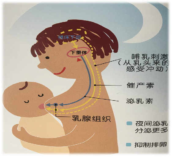 母乳喂养的三角关系:宝宝、大脑和乳房。宝宝吸吮刺激乳头,可引起泌乳反射,即吸吮刺激通过乳头神经末梢传入垂体前叶,引起催乳素释放,催乳素作用乳腺细胞,使之泌乳。在泌乳早期,催乳素释放与乳头刺激程度有一定关系。