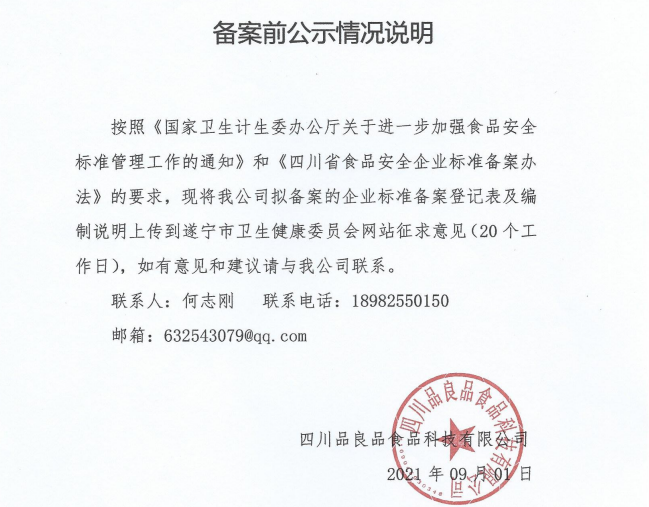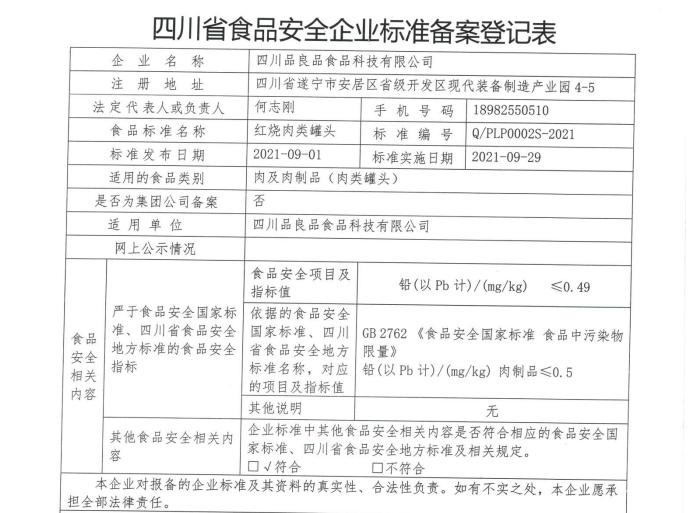 四川品良品食品科技有限公司——红烧肉类罐头食品备案公示(公示截止期2021.9.29)