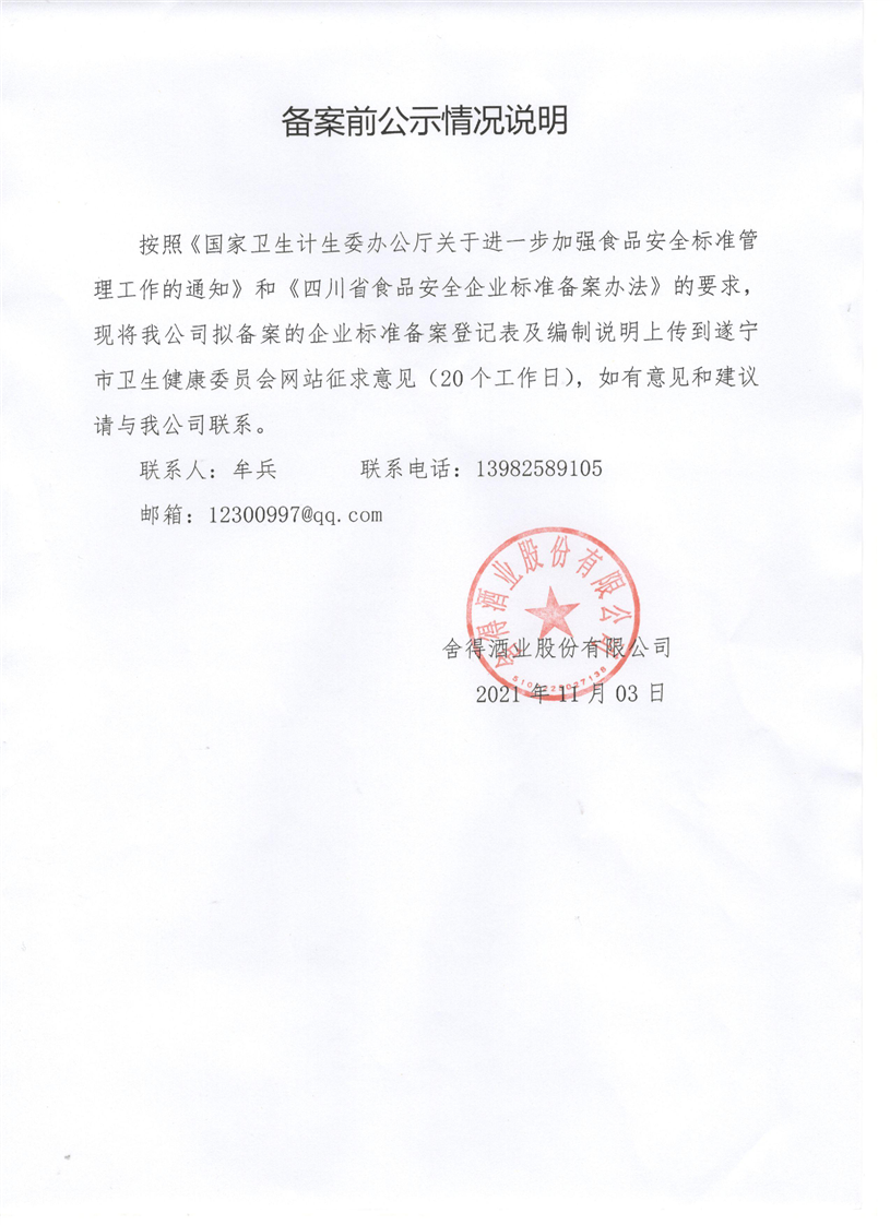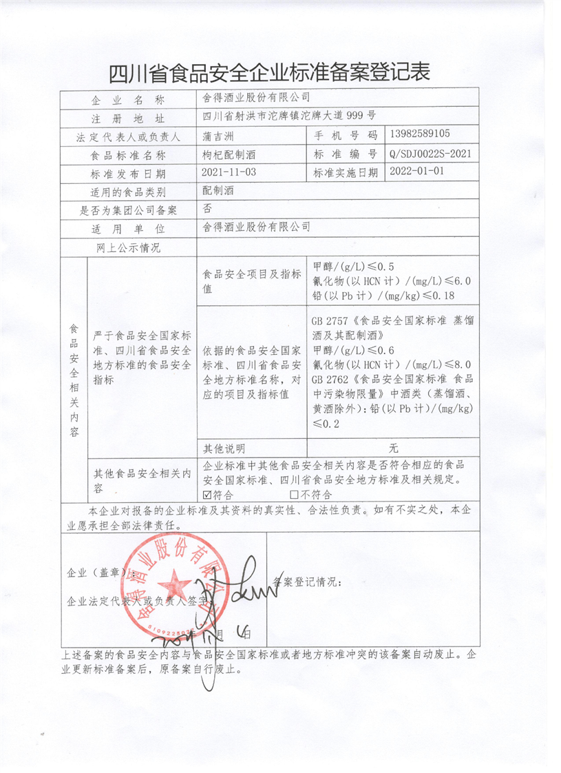 舍得酒业股份有限公司—枸杞配制酒食品备案公示(公示截止期2021.12.3)