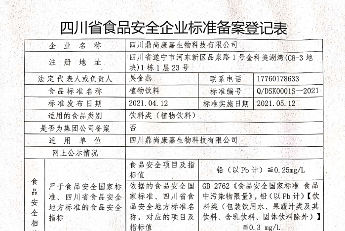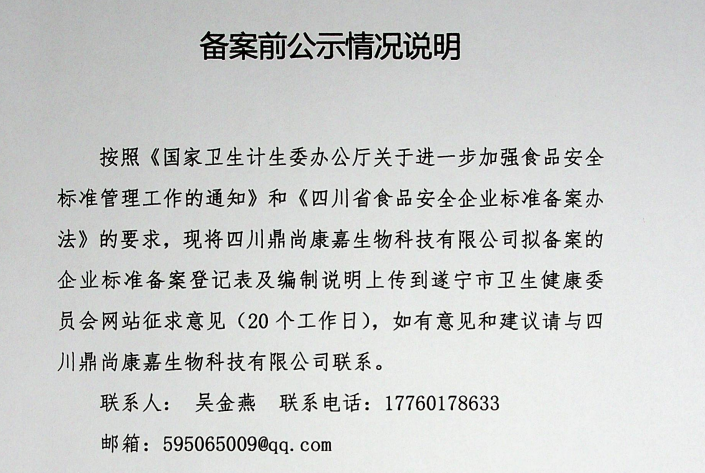 四川鼎尚康嘉生物科技有限公司食品备案公示(公示截止期2021.05.11)