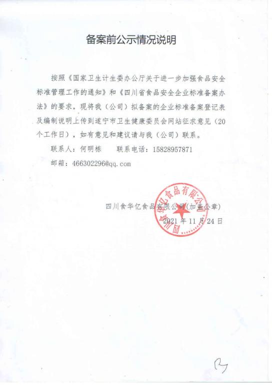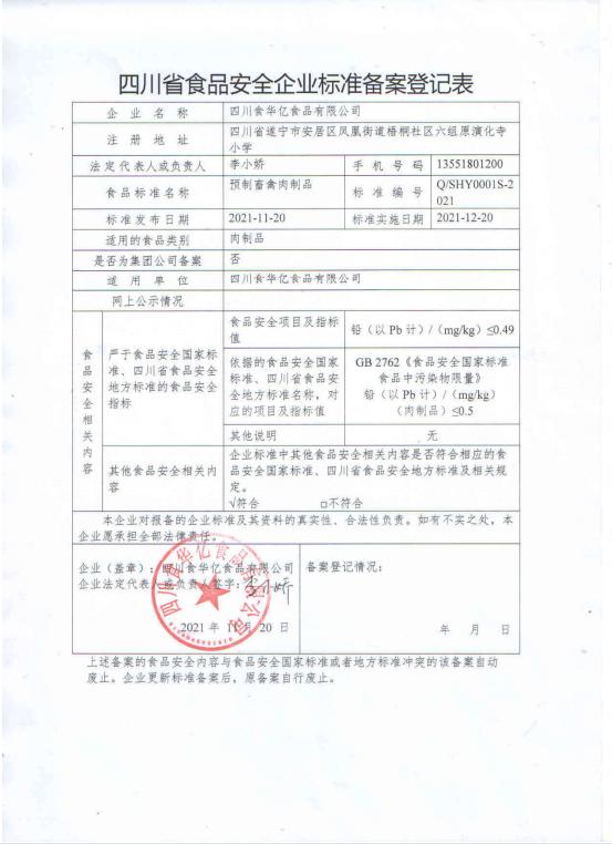 四川食华亿食品有限公司—预制畜禽肉制品(公示截止期2021年12月29日)