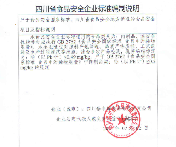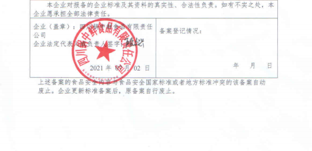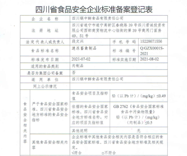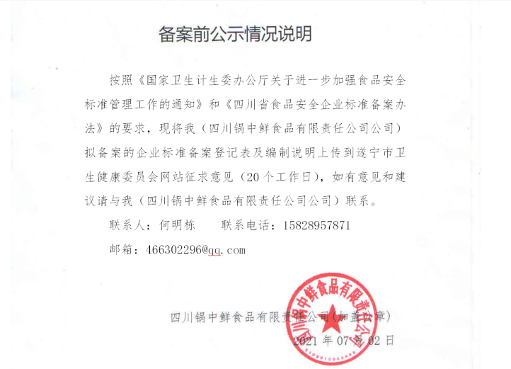 四川锅中鲜食品有限责任公司食品备案公示(公示截止期2021.8.13)