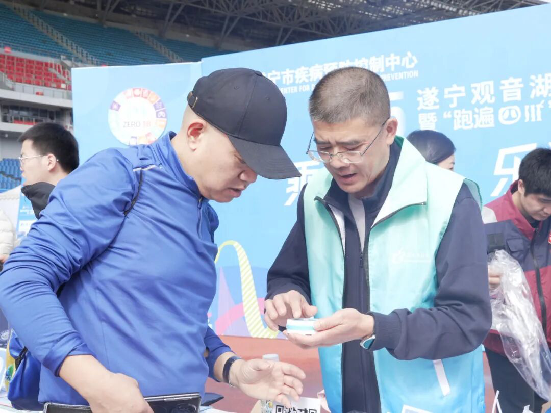 另一边的健康打卡区更显热闹:志愿者们热情邀请跑友扫码关注遂宁疾控新媒体账号,同步发放科普折页、运动背包、洗漱包等宣传品,其中体重指数腰围尺尤其受欢迎,不少跑友当场对照说明测量,实时了解自身健康状况。“这个尺子太实用了,平时自己都没留意过腰围标准!”一位跑友边测边说道。