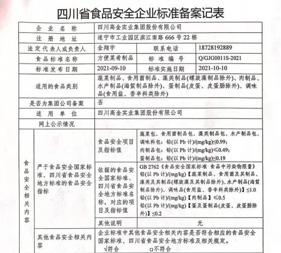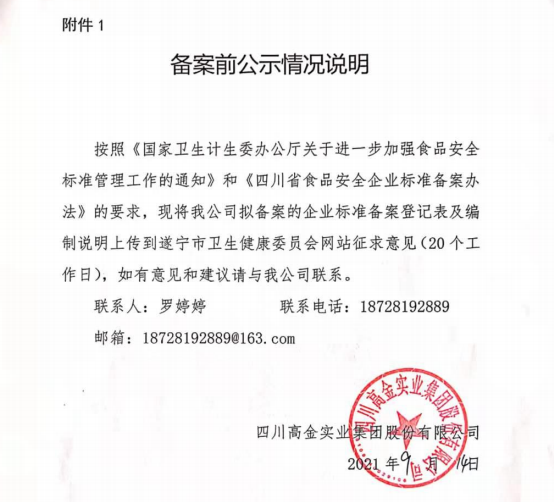 四川高金实业集团股份有限公司—方便菜肴制品食品备案公示(公示截止期2021.10.18)