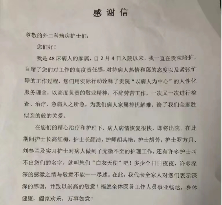 该患者因“脑出血”到骨科、神经外科住院治疗,初入院时患者病情严重,家属情绪紧张且非常焦虑。骨科、神经外科医护了解情况后,积极与患者及家属沟通,给出最佳的治疗及护理方案,并加以心理辅导,经过一段时间的治疗及精心护理后病情明显好转。在康复出院之际,特送来感谢信。一封小小的感谢信,它传递的不仅是患者的感激之情,更是对医护人员无声的肯定与鼓舞,也是他们最珍贵的礼物。