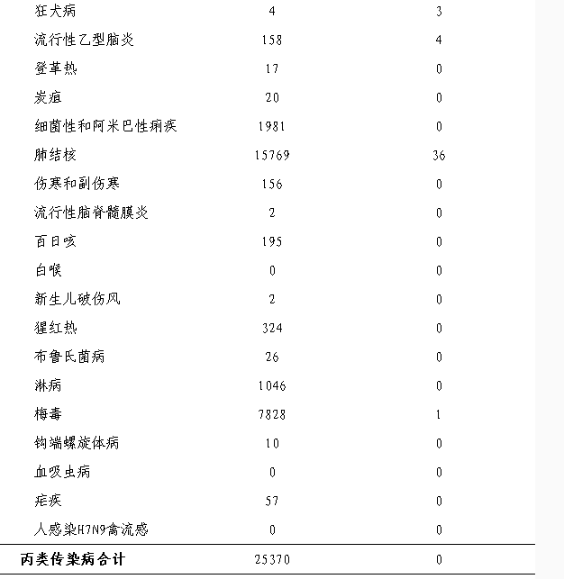 本季度报告丙类传染病10种,无丝虫病报告。发病25370例,无死亡。报告发病数居前3位的病种依次为:手足口病、其它感染性腹泻病和流行性腮腺炎。