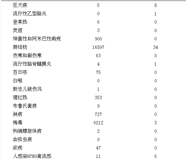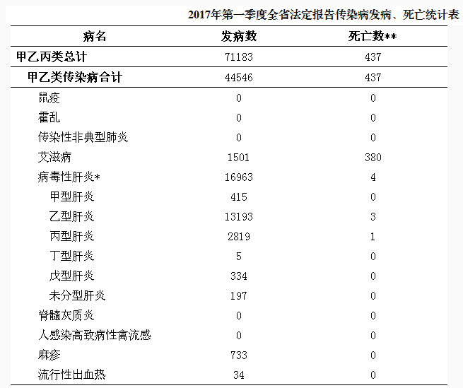 根据国家传染病报告信息管理系统统计,2017年1月1日至3月31日,全省共报告甲乙类传染病20种,发病44546例,死亡437人。无鼠疫、霍乱、传染性非典型肺炎、脊髓灰质炎、人感染高致病性禽流感、乙脑、白喉和血吸虫病发病、死亡报告。报告发病数居前5位的病种依次为:肺结核、乙肝、梅毒、丙肝和艾滋病。报告死亡数居前3位的病种依次为:艾滋病、肺结核和狂犬病。