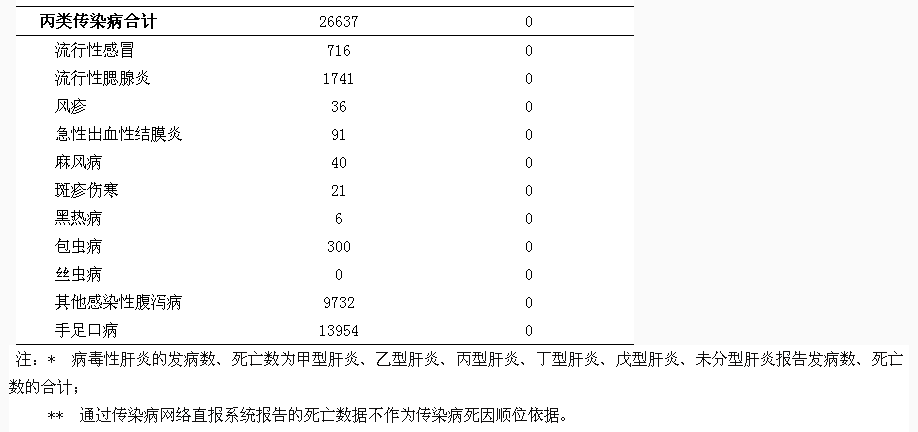 本季度报告丙类传染病10种,发病26637例,无死亡病例。无丝虫病报告。报告发病数居前3位的病种依次为:手足口病、其他感染性腹泻病和流行性腮腺炎。