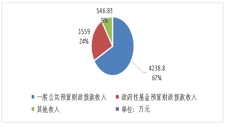 2020年本年收入合计6344.63万元,其中:一般公共预算财政拨款收入4238.8万元,占66.80%;政府性基金预算财政拨款收入1559万元,占24.57%;其他收入546.83万元,占8.63%。