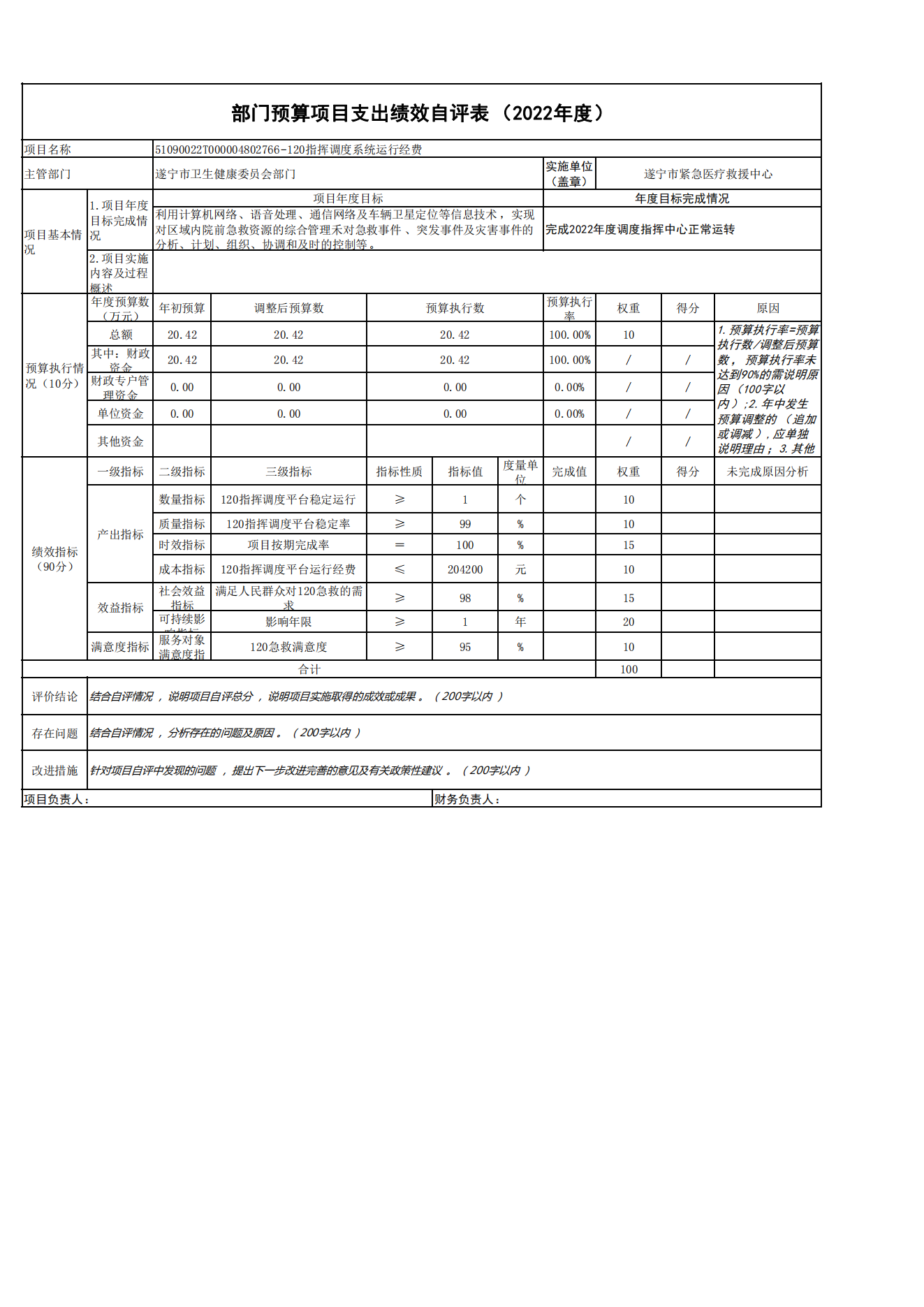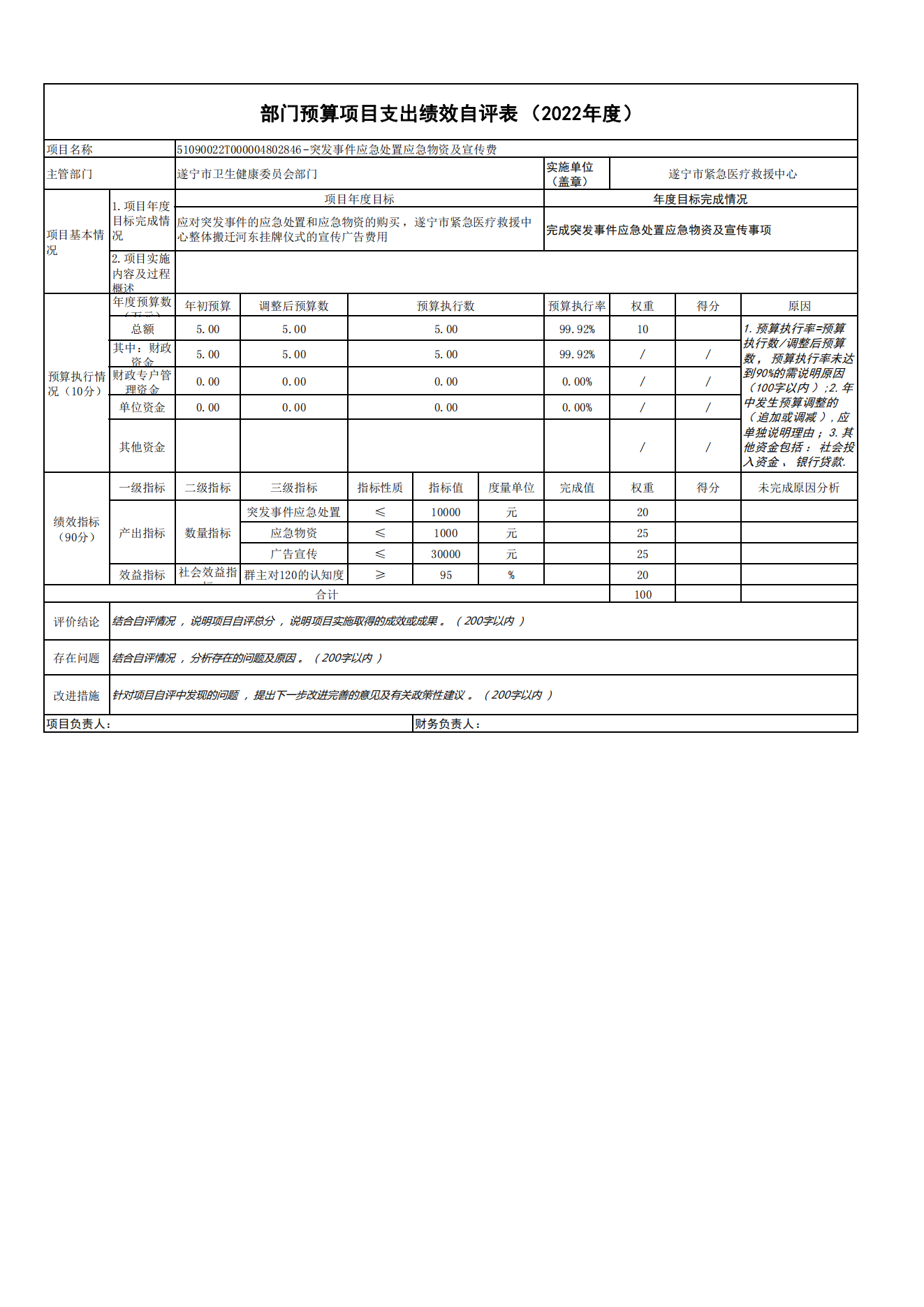 根据预算绩效管理要求,本单位在2022年度预算编制阶段,组织对120指挥调度系统运行经费项目、突发事件应急处置及应急物资经费、设备购置经费三个项目开展了预算事前绩效评估,对三个项目编制了绩效目标,预算执行过程中,选取两个项目开展绩效监控,年终执行完毕后,对两个项目开展了绩效自评。同时对2022年单位整体支出开展绩效自评(详见第四部分附件)。