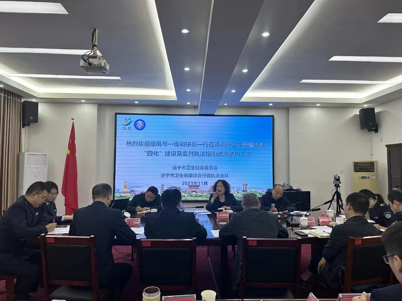 11月7日,省卫生健康委综合监管处一级调研员康凤琴一行莅遂调研指导遂宁市卫生健康监督执法“四化”建设及监督执法指南试点试用工作。