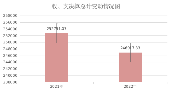 2022年度收、支总计246917.33万元。与2021年相比,收、支总计各减少5833.74万元,下降2.3%。主要变动原因是2022年是因为新冠疫情爆发最严重的时间,导致了事业收入下降。