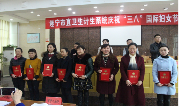 市卫计委副主任李友军宣读市妇联和市卫计委表扬的三八红旗集体、三八红旗手、巾帼建功标兵的通报,表扬了受市妇联表彰的三八红旗集体(遂宁市中心医院)、三八红旗手(遂宁市中医院呼吸内科主任黄超群)和受市卫计委表扬的3个三八红旗集体、15名三八红旗手、17名巾帼建功标兵,为市卫计委表扬的三八红旗集体、三八红旗手和巾帼建功标兵颁发了奖牌、荣誉证书。
