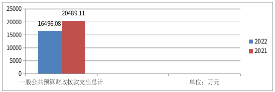 2022年一般公共预算财政拨款支出16496.08万元,占本年支出合计的4.40%。与2021年相比,一般公共预算财政拨款支出减少3993.03万元,下降19.49%。相关经费经财政事权已分配至项目实施单位账户,所以到账一般公共预算财政拨款支出相应减少。