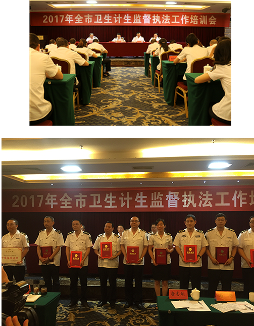 6月29日下午,遂宁市2017年卫生计生监督执法工作会议在市城区召开,市卫计委主任、党组书记李道丕,副主任田家斌出席会议并作重要讲话。市卫监支队全体干部职工,各县(区)卫计局分管领导、监督执法股长,监督执法机构班子成员,全市首届“十佳监督卫士”及卫生监督协管员代表共70余人参加了会议。
