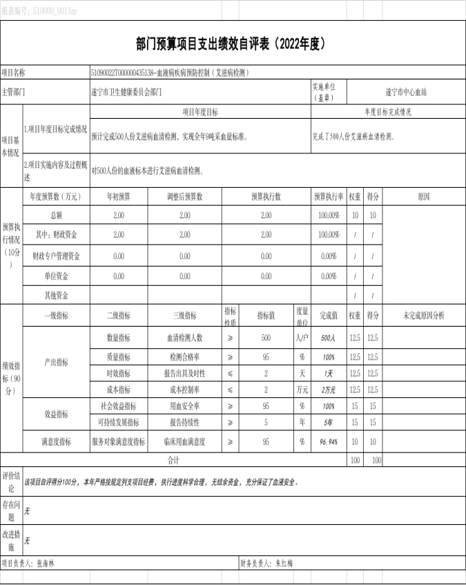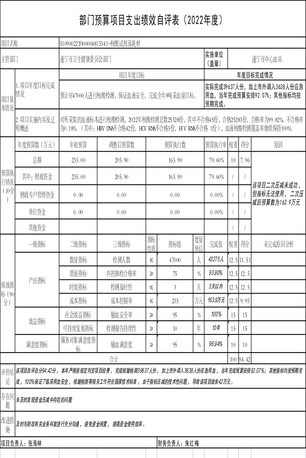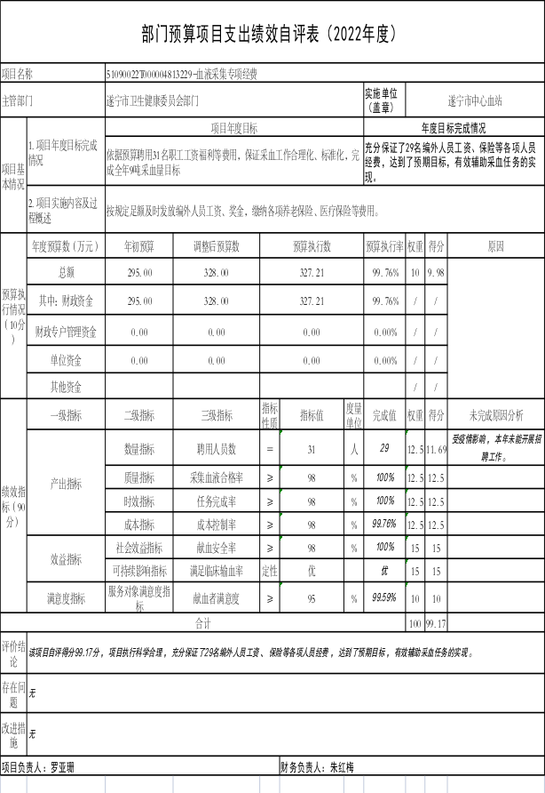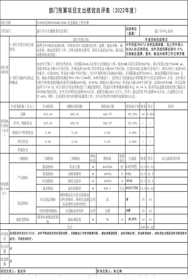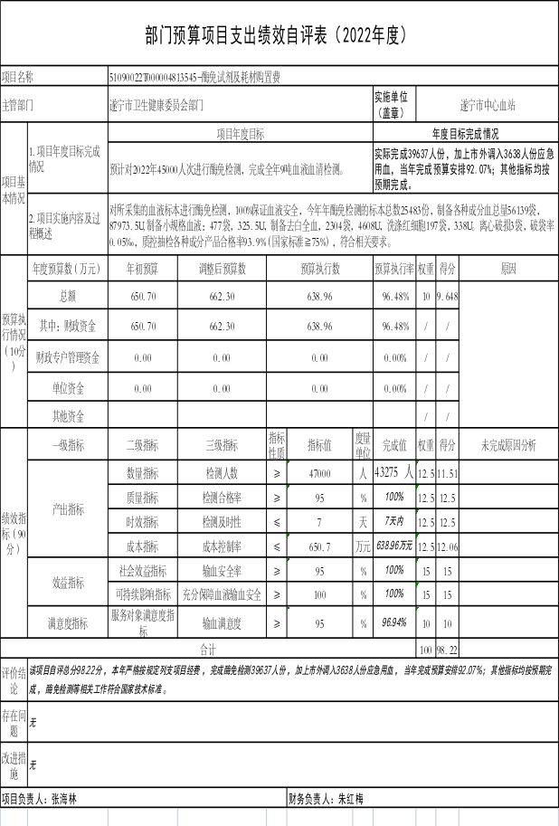 根据预算绩效管理要求,本单位在2022年度预算编制阶段,组织对无偿献血工作经费项目等6个项目开展了预算事前绩效评估,对6个项目编制了绩效目标,并开展绩效监控,年终执行完毕后,对所有项目开展了绩效自评,2022年特定目标类部门预算项目绩效目标自评表见附件(第四部分)。