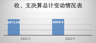 2022年度收、支总计6068.9万元。与2021年相比,收、支总计各增加47.46万元,增长1.59%。主要变动原因是本年清算了单位职工2020年目标奖,发放了2021年目标奖和退休职工独生子女一次性补贴。