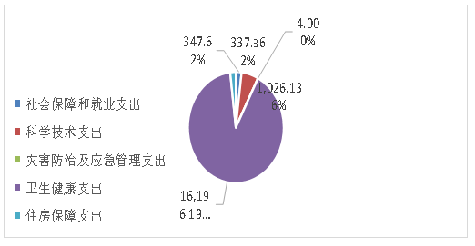 2020年一般公共预算财政拨款支出17,976.03万元,主要用于以下方面:科学技术支出1,026.13万元,占5.71%;社会保障和就业支出347.60万元,占1.93%;卫生健康支出16,196.19万元,占90.09%;住房保障支出337.36万元,占1.87%,灾害防治及应急管理支出4.00万,占0.02%。