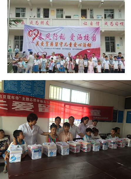 为庆祝六一国际儿童节,弘扬爱幼美德。6月1日下午,大英县人民医院工会主席何平等一行4名医务人员,来到蓬莱镇唐家湾社区及回马镇新龙桥村看望慰问留守儿童,并为18名留守儿童捐赠了儿童成长牛奶,彩色笔、儿童图书等价值3000余元的礼品。 孩子们接过礼品时激动地说:感谢叔叔阿姨们来看望我们,以后我们一定会好好学习,长大也要当一名医生!此外,大英县人民医院还参加了遂宁市《春风行动 爱洒校园》公益活动,捐赠爱心书包70个(蓬莱小学40个,马头小学30个),价值12000余元。